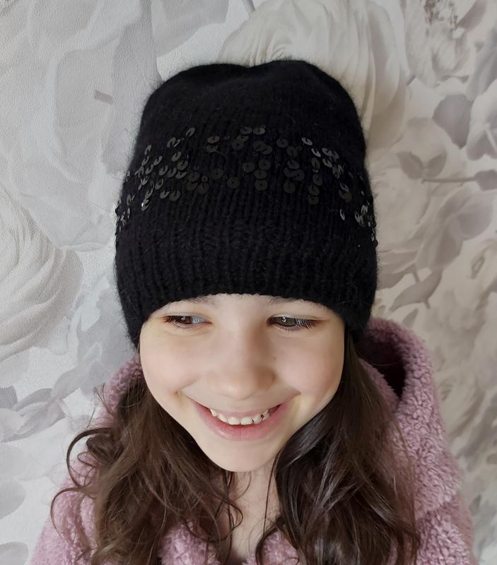 Тепла зимова шапка. Вязаная с пухую норки, украшена пайетками и утеплена флисом. Подойдет на объем головы 49-51 см. На фото объем головы ребенка 51 см.