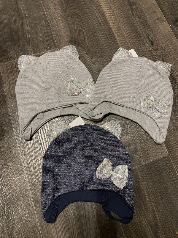 Вязаная шапка из мягкой пряжи с люрексом на і девочку . Склад: верх - 50%-бавовна, 50%-ПАН, люрекс. Подклад: 97%-хлопок, 3%-эластан Размер 48-50 Цвета остались светло-серые, темно-синие с светлыми ушками