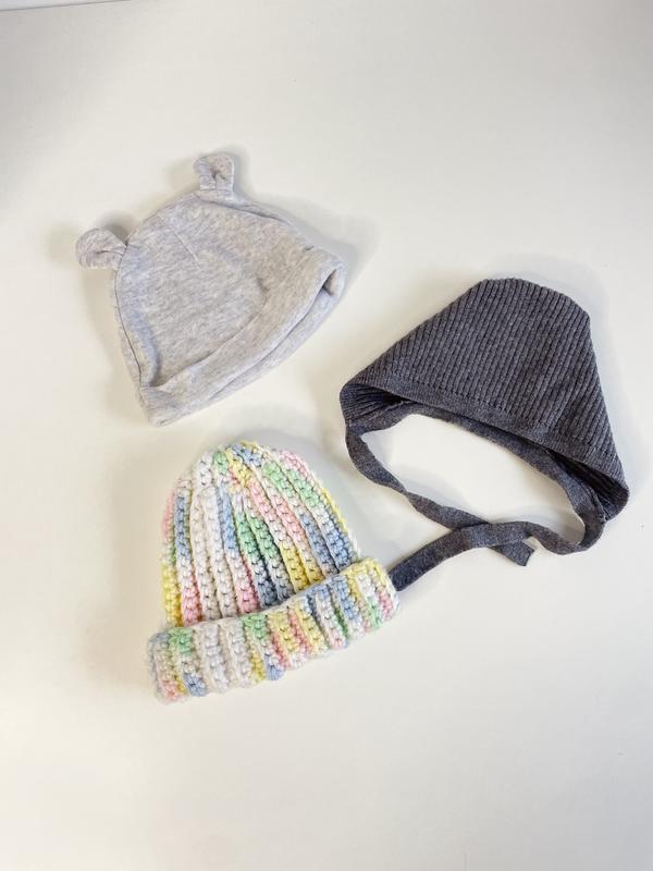 Шапка детская 0-6-9 мес серая с ушками, вязаная разноцветная и в рубчик на завязках