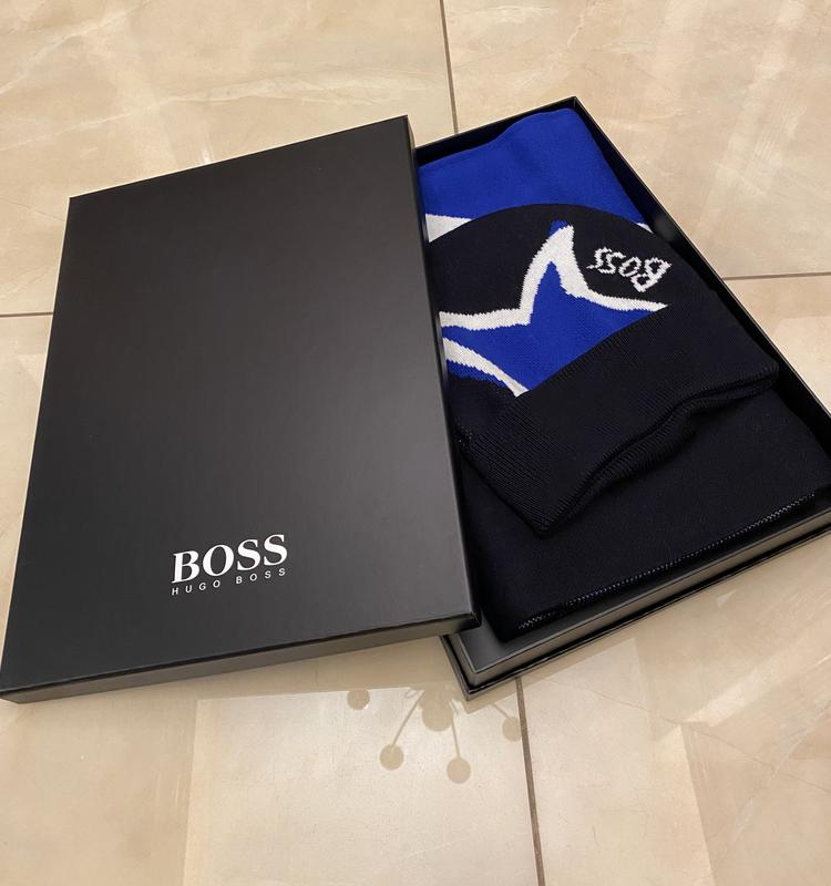 Крутой мужской подарочный набор шапка и шарф HUGO BOSS. Made in Italy. Оригинал!!! Состав: 95%-хлопок; 5%-кашемир. Новый. В подарочной коробке. Коробка 36/26/5,5 см. Длина шарфа - 188 см. Шарф двусторонний.