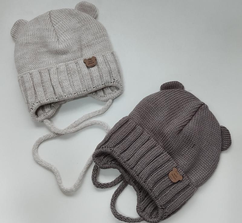 В'язана шапка з утеплювачем, на бавовняній підкладці, із зав'язками. Розмір: 42-46 см.
