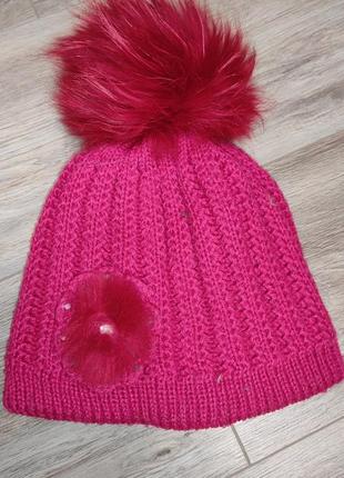Теплая двойная шапка с натуральным помпоном , отличное состояние