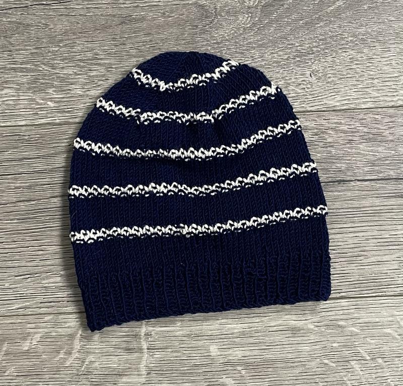 Вязанная шапка на малыша, ручной работы синего цвета в белые полоска. Размер на 1-2-3 года хорошо тянется, объем головы 42-48 см., высота 20 см.