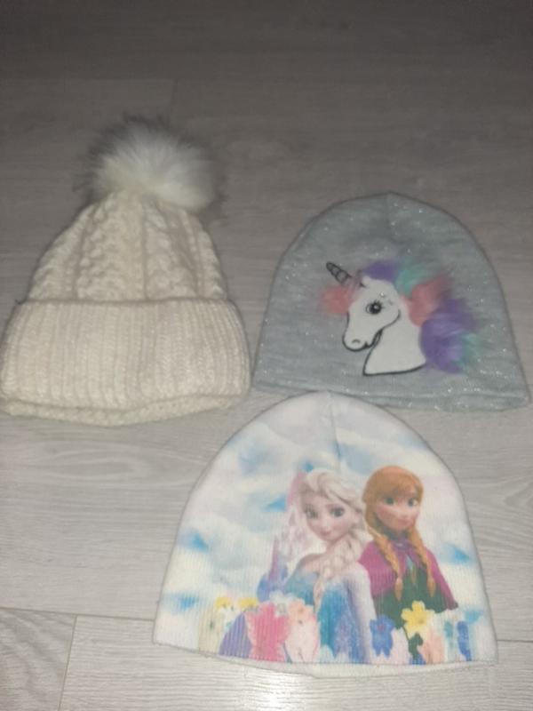Шапочки для девочки на 4-8 лет.Белая с бомбоном очень теплая,всредине подшитая флисом, на зиму120 грн.Серая с однорогом двойная тоже теплая подойдет на холодную осень или теплую зиму,фирма НМ 100 грн. Третья на весну,50 грн или отдам в подарок.если берете все три шт.
