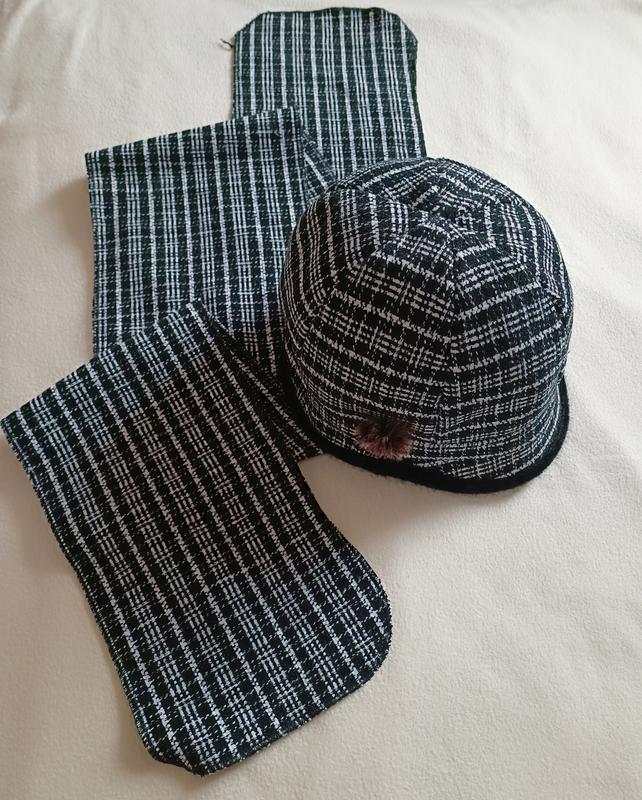 набор : шапка + шарф в клетку, черно-белого цвета, на флисовой подкладке, сзади можно отрегулировать в объеме. Длина шарфа 147см.