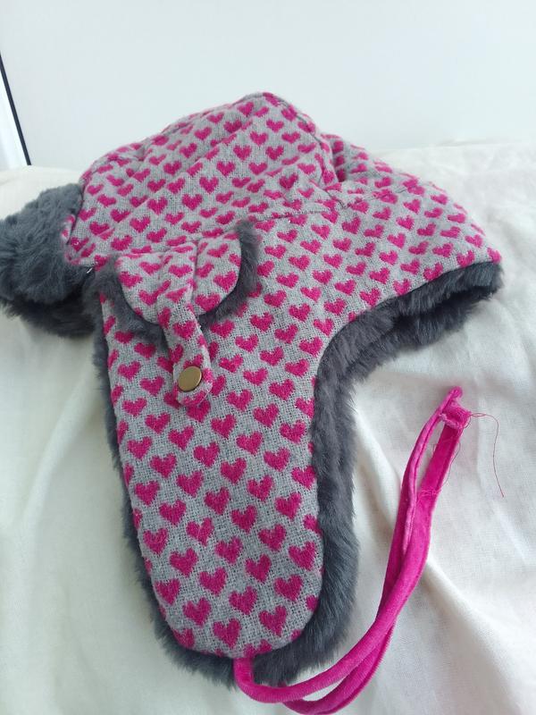 Интересная утепленная шапочка в розовые сердечки ткани с содержанием акрила, 5% шерсти