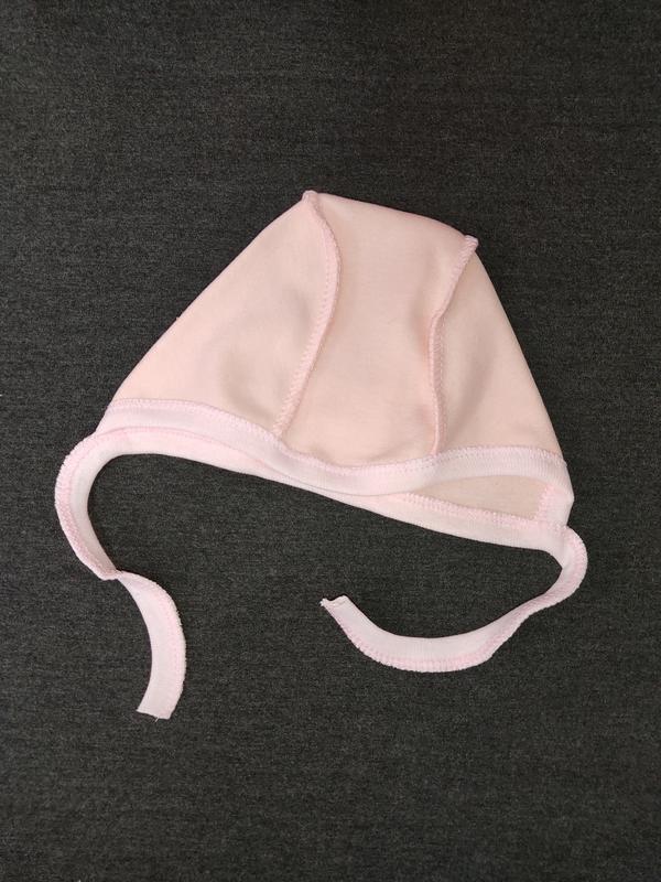 Шапочка з зав'язками для немовлят виготовлена з натуральної бавовняної тканини - інтерлоку. Вироби з інтерлоку гіпоалергенні, добре зберігають форму, не кошлатяться та не втрачають колір при багаторазовому пранні .