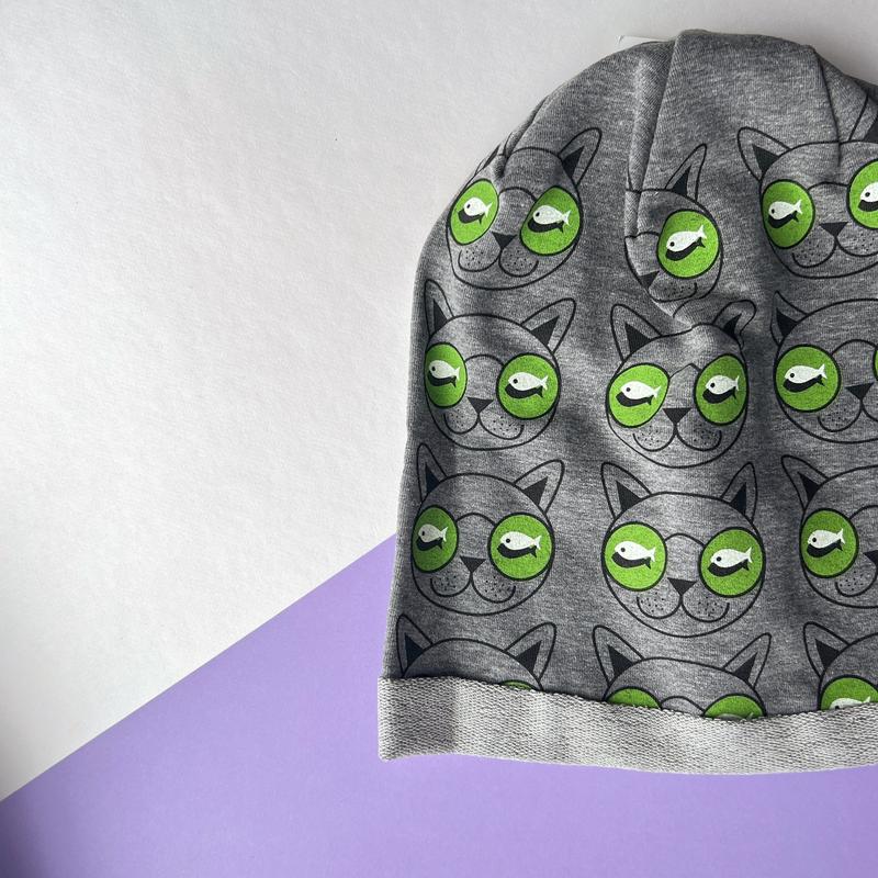 Детская Шапка с рисунком котики в очках рыбки Сезон: весна/лето/осень р. 50-52 Ширина 24 см, высота 26 см