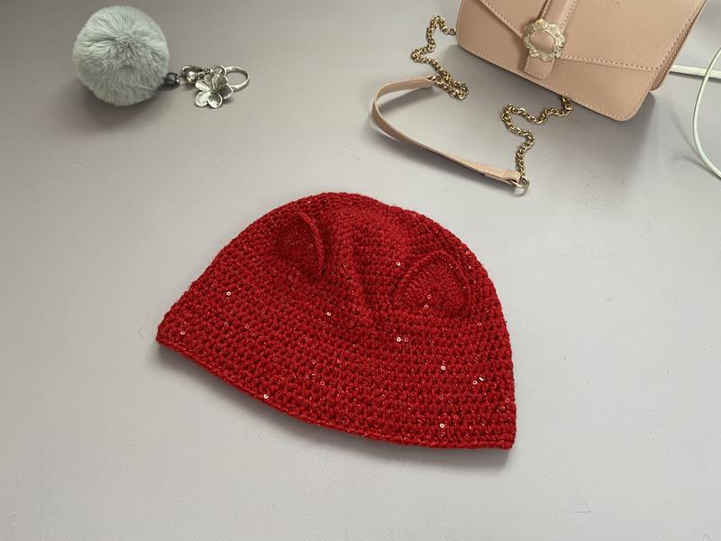 Незмінний тренд - шапка з котячими вушками насиченого червоного кольору з мікропайєткою. Дуже красиво переливається на сонці❤️ Вушка добре тримають форму, шапка звʼязана гачком , підійде на нехолодну погоду/демісезон 100% ручна робота, як і всі речі в моєму магазині 👌 Склад: акрил з пайєткою. Стандартний розмір, на ОГ до 58 см. ОГ манекену 57 см Доставка: відправка новою або укр поштою, протягом 2-3 днів з моменту оплати.