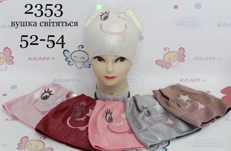 Шапка тоненькая. Ушки светятся. Рисунок нашивка. 100% акрил. Размер: 52-54. Цвет: темная пудра.