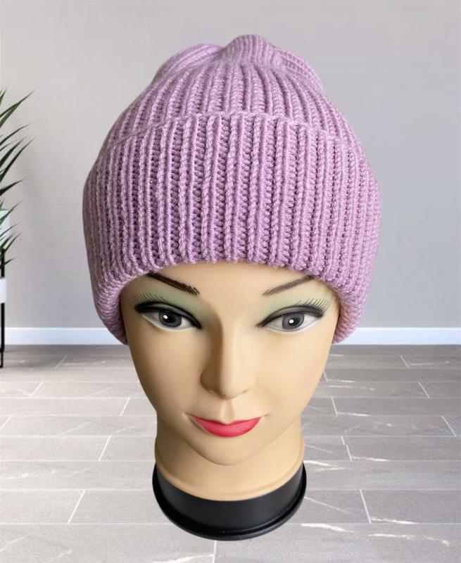 Шапка з нефіксованим відворотом, бузкового кольору, з напіввовняної пряжі. Тепленька, мʼякенька. Ручна робота Розмір : 53-55