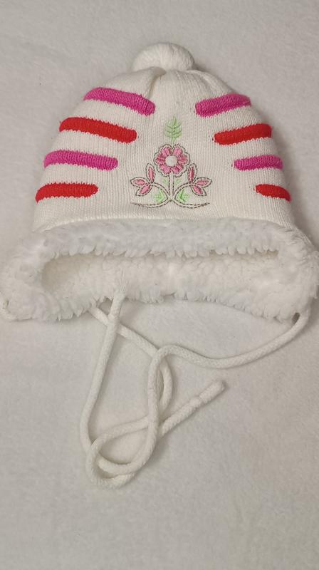 Шапочка для дівчинки від 0 до 3 місяців в ідеальному стані. Плям та рваностей немає. Дуже тепла, тому рекомендую на зиму або холодну весну чи осінь.