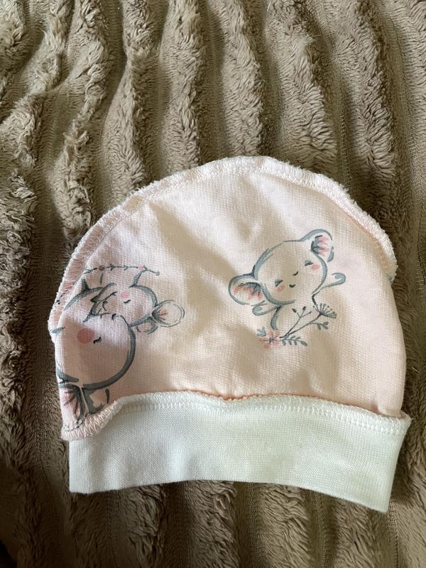 Шапочки для дівчинки з народження і десь до 3-4міс, деякі і не вдягалися навіть, деякі можна носити як швом всередину так і на зовні