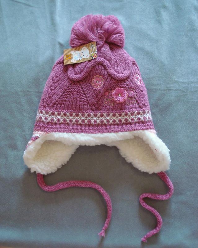 Очень теплая зимняя шапочка с цветочками размер 50-54