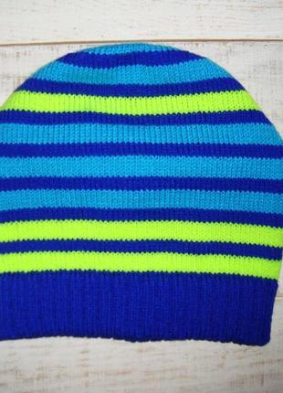 Шапка біні, машинна в'язка. Нитки 100 % акрил, яскраві кольори. Розмір універсальний. Підійде для діток від 3-4 років і до підлітка . Шапка одинарна, подвійна гумка (в два шари лише гумка ). Є інші забарвлення і для хлопчика і для дівчинки. Виміри в не розтягнутому вигляді : Ширина шапки по гумці 19,5-20 див, ширина по лицьовій гладі 22 див., висота 24-25 див. Добре тягнеться в ширину.
