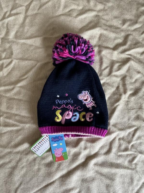 Дитяча зимня шапочка з балабоном в темно-синьому кольору, має нашивку свинки пепи . Нова Ціна: 350грн