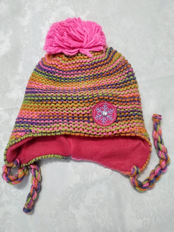Шапка зимняя теплая на девочку, на завязках, материал: вязка,флис.Приемная на ощупь, " не кусает".Состав: 80% акрил, 20% шерсти.. Висота 17 см, ширина 24 см.