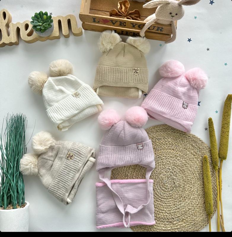 Зимний набор, производства Украина, с двумя бубонами! Шапка и снуд утеплены флисом. Качество- люкс! Шапка глубокая, красиво принимает форму головы, закрывает ушки, с связками. Снуд высокий, теплый и удобный. Размер: (42-44)- визуально с рождения-12 мес Цена: 505 грн КрохпельКа
