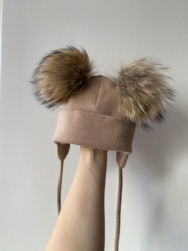 Зимняя шапка с двумя натуральными помпонами из енота, внутри флисовая подкладка, очень удобная и стильная, плотно прилегает и не оттопывается у ушек! Помпоны внутри крепятся атласной лентой и легко снимаются, что удобно при стирке Подходит на возраст 1,5 -3 года