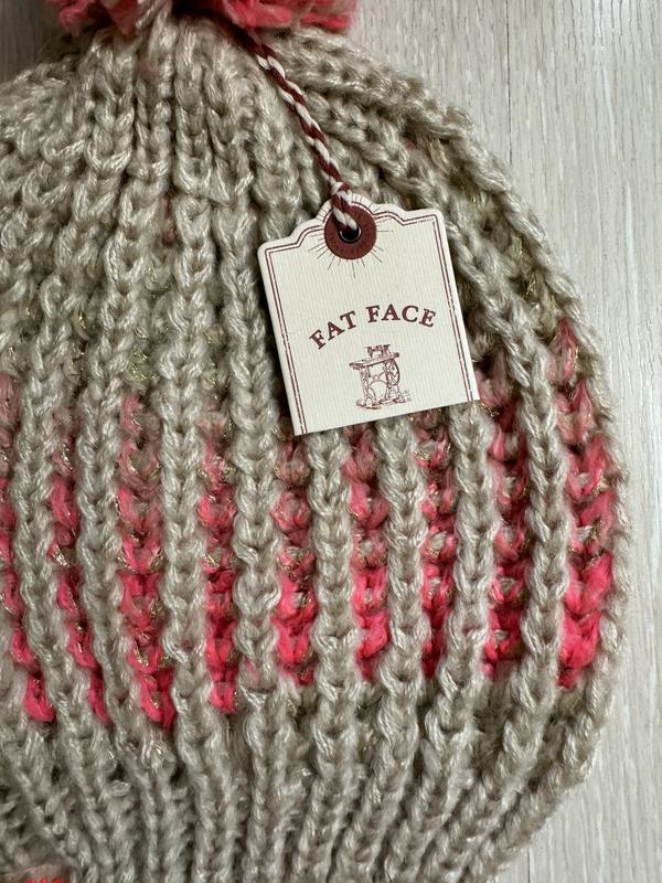 В наличии красивая вязаная шапка фирмы FAT FACE. Состав: 88% акрил, 10% полиестер и 4% блестящая нить...нитка мягкая и приятная к телу, хорошо тянется. Длина без бубона - 24 см, длина с бубоном - 29 см, ширина – 18 см + еще хорошо тянется.