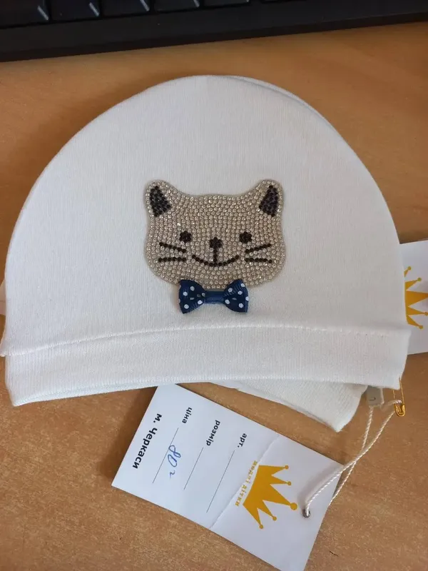 Трикотажная шапка для девочки 3-6 мес цвет молочный Украшена принтом в виде котика виложеного бусинами