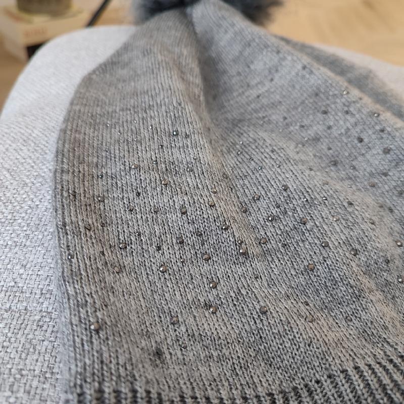 шапка на женщину девушку, серого цвета украшена маленькими стразами, новая, с помпоном, акрил с шерстью