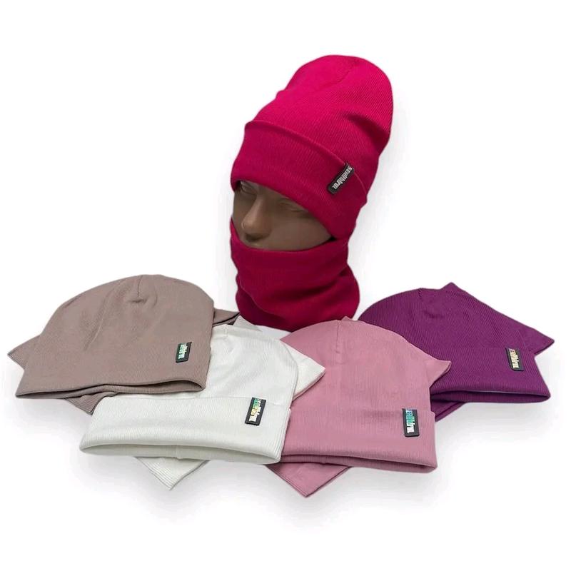 Набор шапка и хомут из трикотажа в рубчик на полном флисе ✔️Размер:50-54 Цвет: белый, фиолетовый, малина