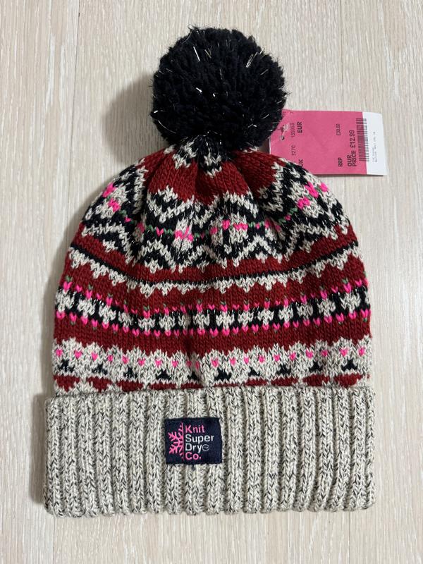 В наличии красивая вязаная тёплая шапка фирмы SUPERDRY. Состав: 86% акрил. 10% шерсть. 3% полиэстер и 1% серебристая нить...нитка мягкая и приятная на ощупь, хорошо тянется. Длина без бубона - 24 см, длина с бубоном - 29 см, ширина - 20 + см и ещё хорошо тянется.