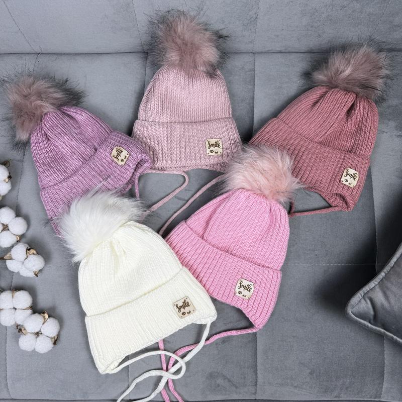 ❄️Шапка Smile. Вазаная, подкладка - флис. На завязках. 📐Размер: (50-52) - ориентивно 2-4 лет высота без помпона 17см
