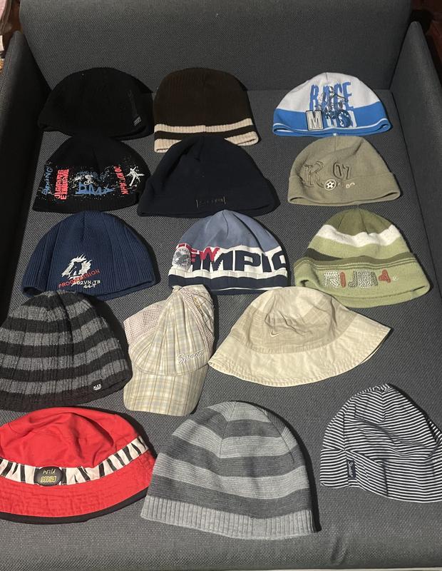 Шапки Цена каждой 30 грн На втором фото представлена коллекция различных головных уборов: • Верхний ряд: теплые зимние шапки разных цветов, включая черный, коричневый, сине-белый и оливковый, идеально подходят для холодного времени года. • Средний ряд: варианты с принтами и надписями, стильные шапки для повседневной носки в прохладную погоду. • Нижний ряд: разнообразные шляпы и панамы, включая красную панаму, бейсболку и легкие полосатые шапки для весенне-осеннего сезона.