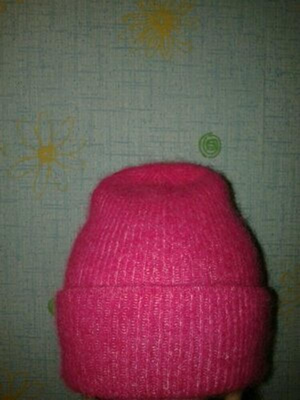 Шапочка в очень хорошем состоянии. Практически без следов носки. Никаких повреждений, без потертостей и без катышек. Внешне выглядит отлично. Состав 32% акрил, 30% ПА, 30% шерсть, 8% эластан. Трикотаж средней плотности. По поверхности пушится.Вязка типа резинки 1х1, как дорожками. Не кусается. Цвет розовый. В глубине проявляется белый. Шапка длинная, выглядит как чулок. Рассчитана на высокий двойной отворот. Один шов сзади. В макушке клиньями, бесшовные. Размер небольшой, на 54-55-56. На небольшую голову или для девочки. На фото одета на 55 размер.