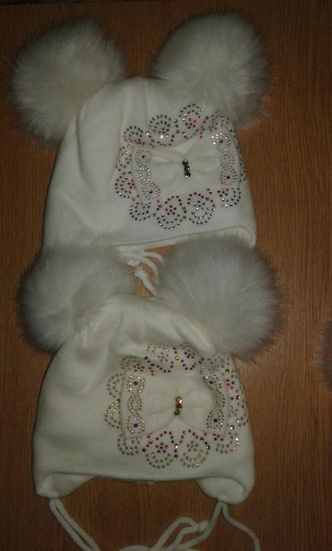 Вязаная шапочка на меху-травке и завязках. с песцовыми помпонами на 2-3,5 года может даже и до 4 лет будет в зависимости какой обьём головы у ребёнка.