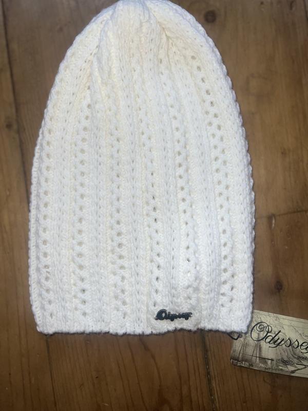 Вязаная белая шапочка, без подкладки. Красивое ажурное плетение. Высота шапки 25 см Ширина 18 см Тянется до 36 см Состав 60 % вовна 20% акрил 20% нейлон