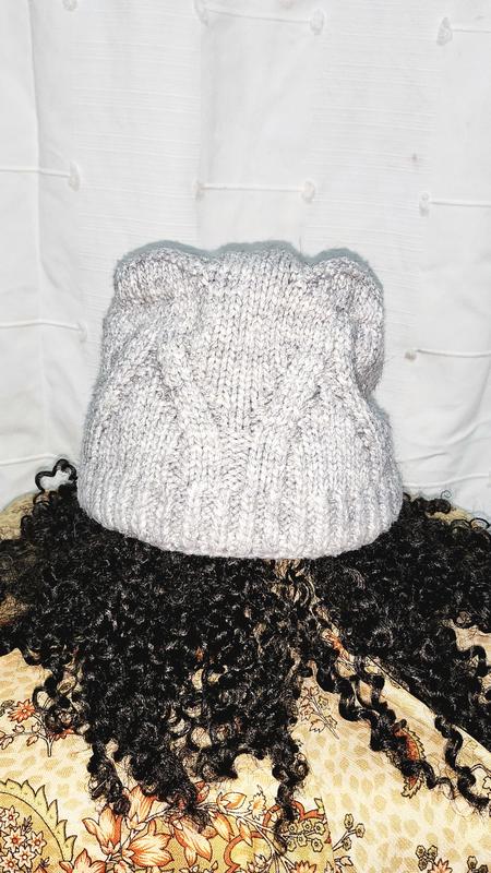 Женская двойная вязаная шапка с ушками. Очень стильно смотрит на голове. Свет серого цвета. Акрил. Машинная вязка. Высота 17 см. Объем по резинке 50 см. Тянется. Дирок, пятен затяжек нет. В очень хорошем состоянии.