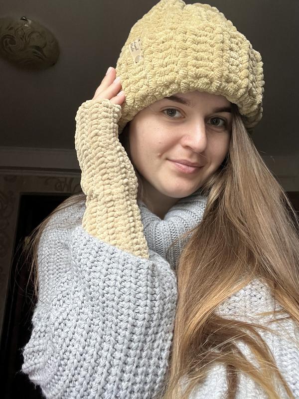 Зимняя теплая шапочка, выполненная объемной вязкой, на голове сидит красиво. Цвет пудра. Шапочка плюшевая и очень приятная на ощупь) также могу связать в цвете, который вы хотите) пишите в сообщения 🥰