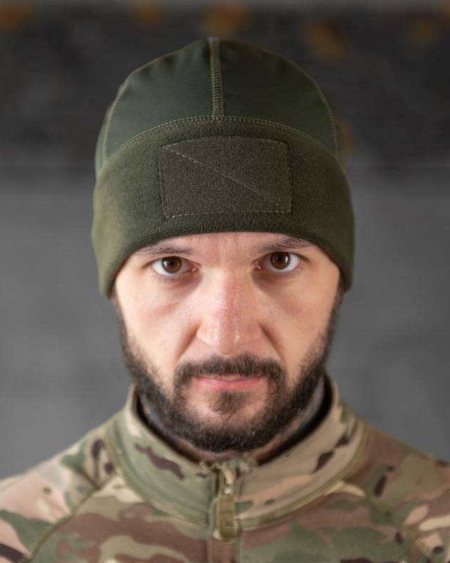Шапка флисовая хаки с вставкой soft-shell и липучкой под шеврон