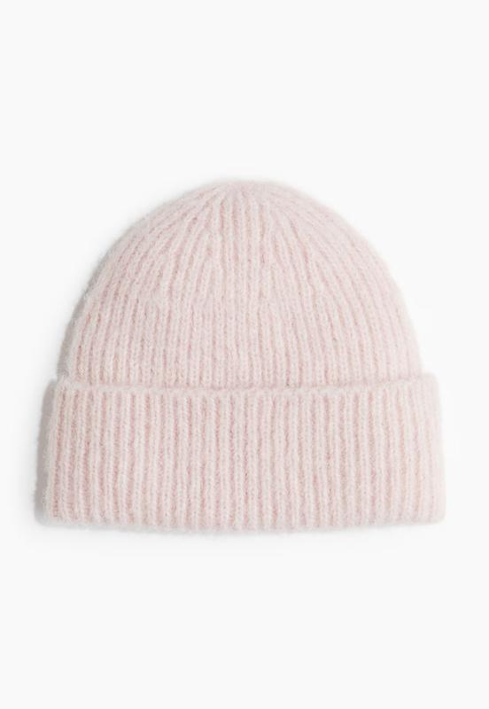 Шапка H&M з широким підгорнутим краєм з м'якого пухнастого трикотажу в смужку. Приємна на дотик. Тепла. Колір такий як на фото з сайту, ніжно-рожевий. Розмір: ONESIZE