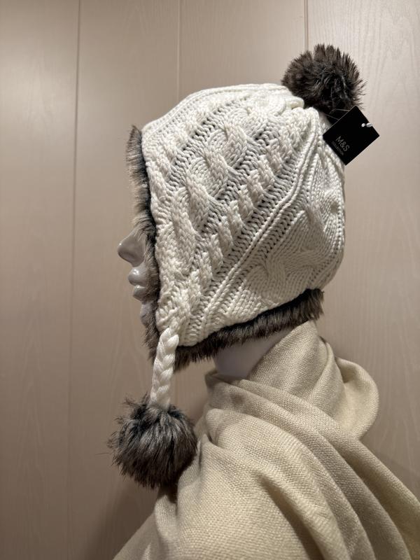 В наличии красивая тёплая шапка фирмы M&S. Состав: 100% акрил, нитка мягкая и приятная к телу, хорошо тянется. Длина без бубона спереди-19 см, с бубоном-24 см, длинна сбоку-28 см, ширина-25 см+ очень хорошо тянется. На размер головы примерно 55 см.