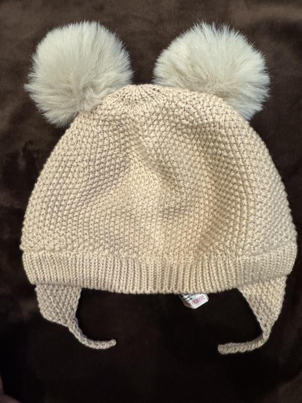 Бежевая шапка с помпонами, очень красивая Подойдет как мальчику так и девочке Размер 3-6 месяцев Стан идеальный, одетая пара раз