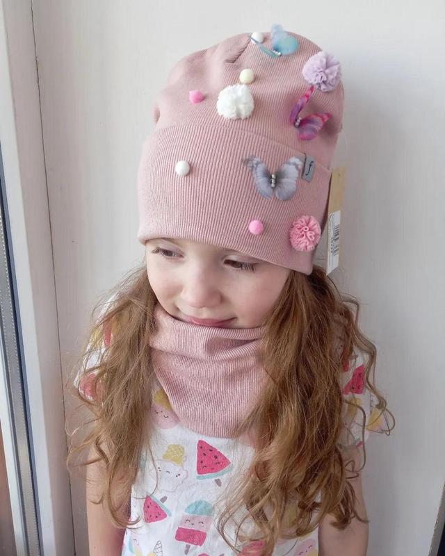 💕Шапочка с бабочками Весна-осень) ✅️Цена шапочка + хомут 770 грн ✅️Цена шапочка 685 грн ✅️На обхват голови 46-50 і 51-55 см. Тканина рубчик(90% бавовна,10% еластан)