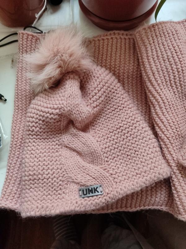 Продам набор шапку+хомут,вязка машина,цвет нежно розовый.Стан идеален.