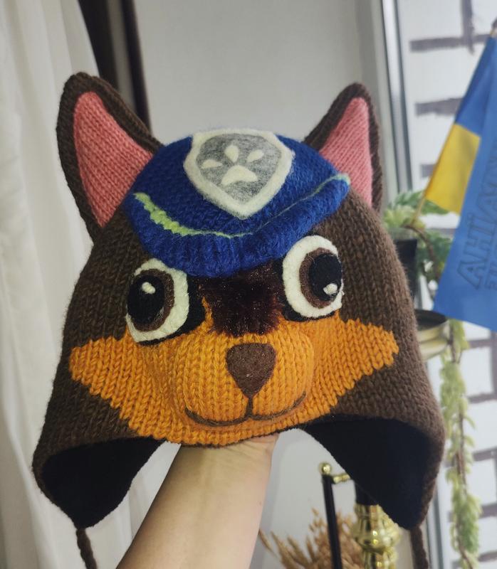 Оригинальная вязаная шапка в виде собачки из мультфильма " щенячий патруль". На фото взрослый, может быть и на подростка, на бирке желаемый возраст не указан. Окружность головы 55.56 см. Размеры предоставлены, состояние идеальное.Подкладка флис, очень теплая