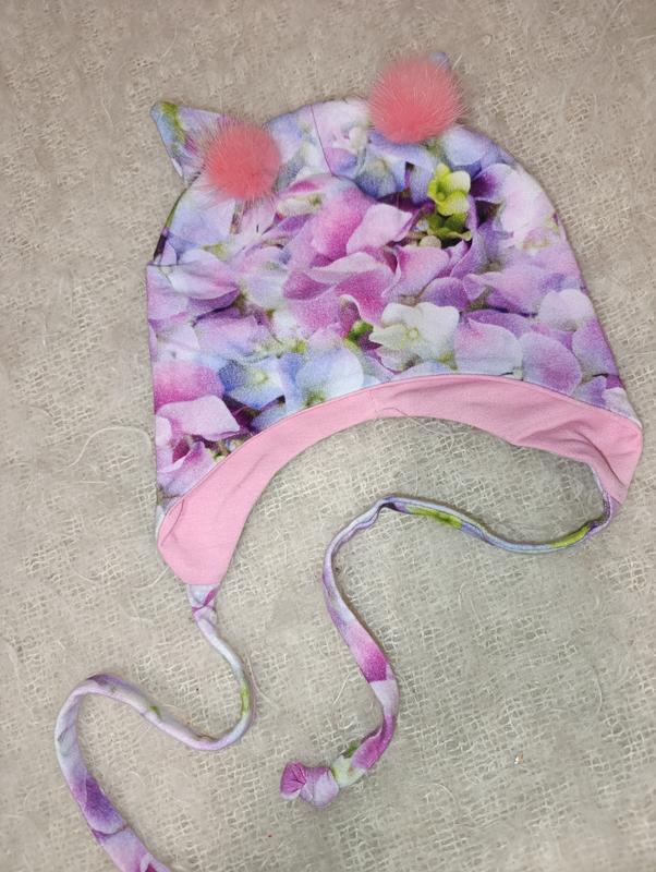 Новая шапка, двойная, на подкладке. На теплую весну- осень ( трикотаж двухнитка) Помпоны из натурального меха Размер 44-46 Ширина 21-23 Высота 14 На 6-9 месяцев
