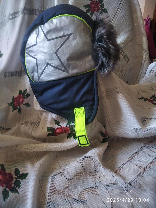 Пречудная, суперовая шапка, утепленная на синтапоне,теплая, светло-серого цвета подкладка, взгляд с меха,сама шапка темно-серого цвета, по бокам вставки светло-серого цвета-серебристые звезды, с внешней стороны салатовый кармашек на молнии,фирмовая лейба "супер-стар", застегивается на яркую салатовую липучку,легкая,теплёнка, яркая-чудо.