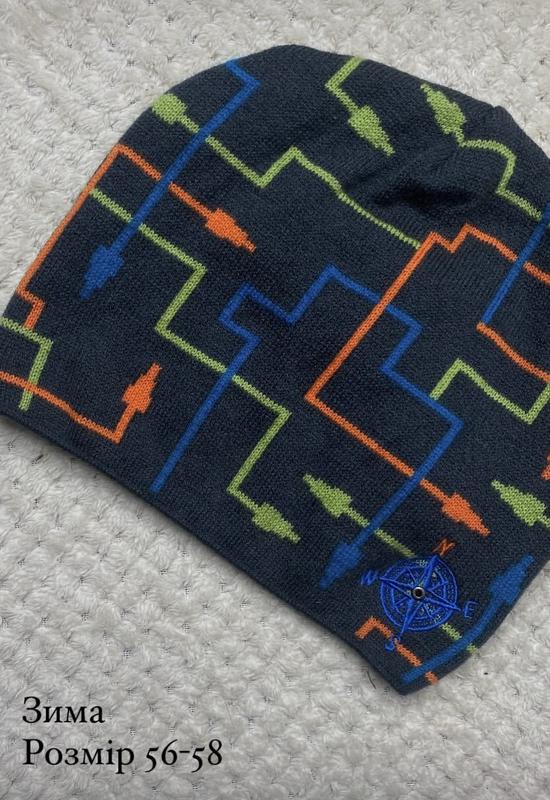 Зимова в'язана шапка темно-сірого кольору з яскравим геометричним візерунком у синіх, помаранчевих та салатових тонах. Оригінальний дизайн доповнено вишитим зображенням компаса збоку. Тепла та затишна пряжа забезпечить комфорт у холодну пору року. Розмір 56-58. Стильний аксесуар для тих, хто цінує оригінальність та тепло.
