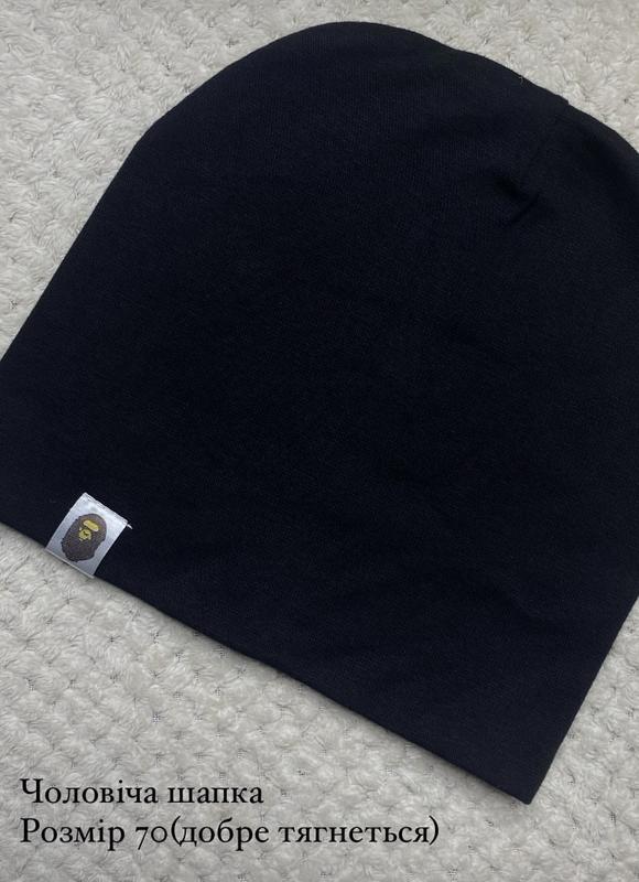 Чоловіча в'язана шапка класичного чорного кольору з фірмовим логотипом мавпи від відомого бренду BAPE (A Bathing Ape). М'яка та еластична пряжа забезпечить комфортну посадку та тепло у прохолодну погоду. Розмір 70 (добре тягнеться), що робить її універсальною. Стильний аксесуар для тих, хто цінує оригінальний вуличний стиль.