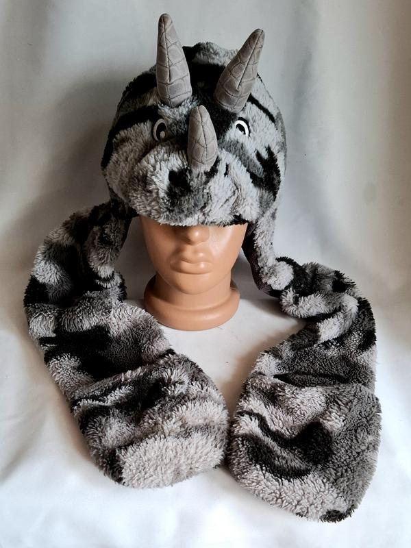 Динозавр карнавальная меховая шапка-ушанка с ушами рукавицами,на флисовой подкладке, расцветка камуфляж на 4-8 лет ЗАМЕРЫ Длина от макушки перед/зад/ухо 18/28/78см 234