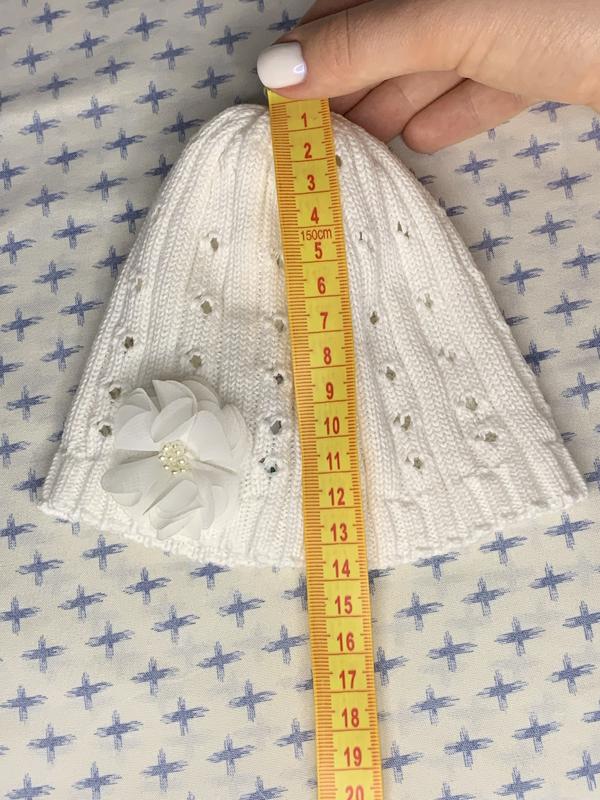 Вʼязана біла шапочка для дівчинки 2-4 місячної. Має милу білу квітку з бісером у середині. Не є теплою