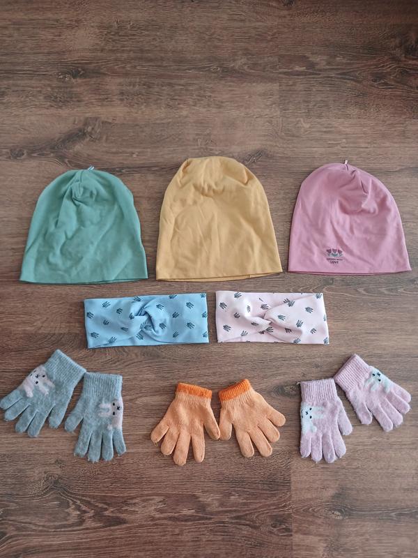 детский набор на девочку 3-4 рюмки.3 шапочки,2 повязки и 3 пары перчаток. шапочки и повязки в идеальном состоянии,печатки с видимыми следами носки.