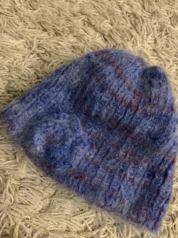 Ручна робота. Ідеальний стан. Середнє плетіння, нитка пухнаста, не тонка, не колеться, добре тягнеться. Колір блакитно-фіолетовий меланж. Реальний відтінок на 1-2 фото та на фото з замірами. Збоку прикрашена декоративною обʼємною вʼязаною квіткою. Оne size. Заміри на фото.